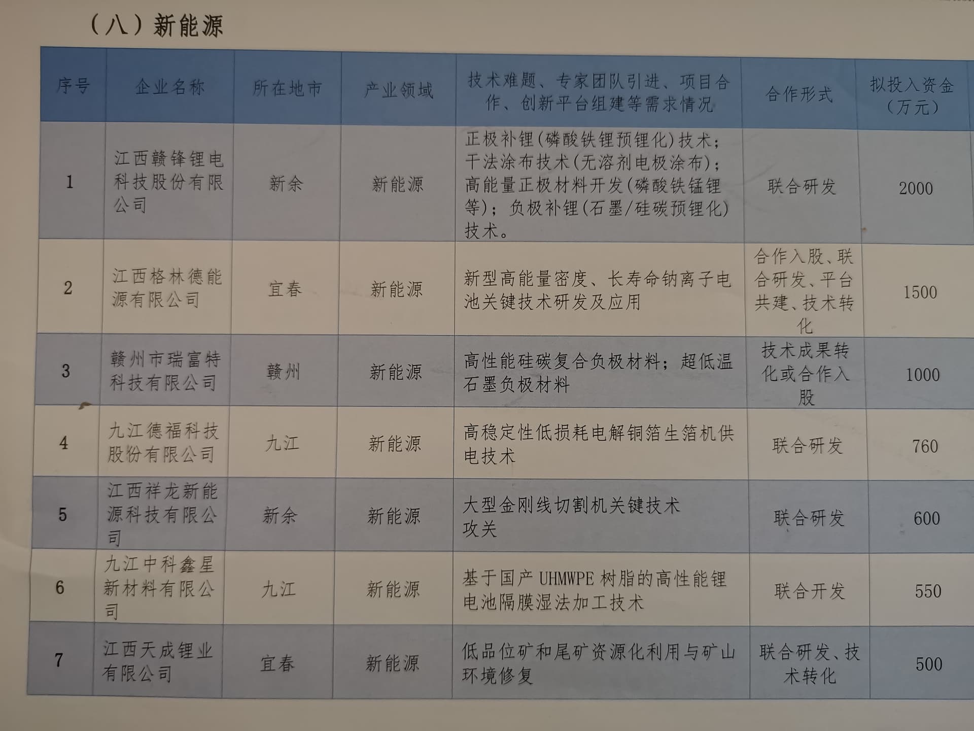 江西省产业技术需求汇编(八)——省内园区内的部分企业技术需求-新能源领域